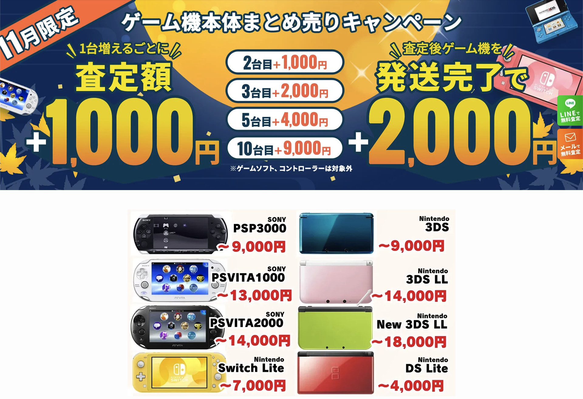今、ゲームワールドでは11月限定で、売却するゲーム機が1台増えるごとに査定額が+1,000円になるゲーム機本体まとめ売りキャンペーンを実施中です。